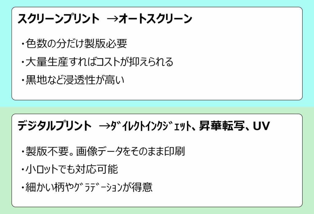ダイレクトインクジェットやスクリーンプリントとの違いも踏まえつつご紹介していきます。